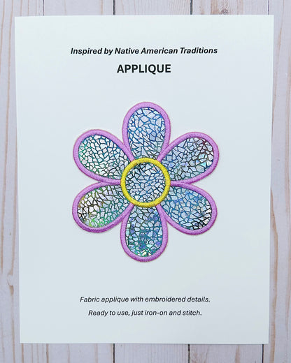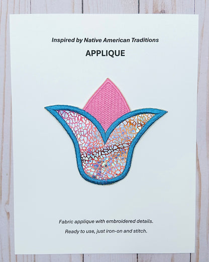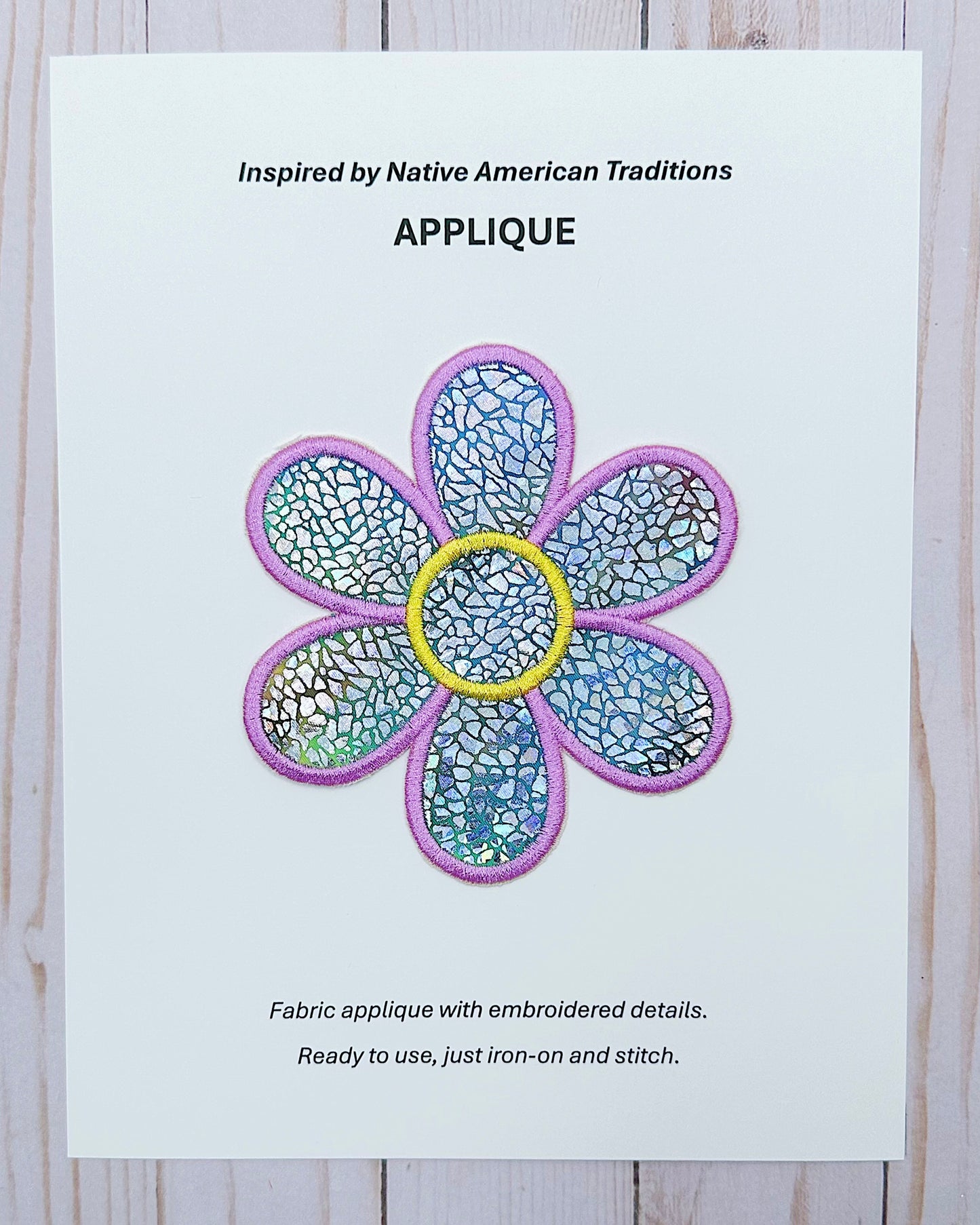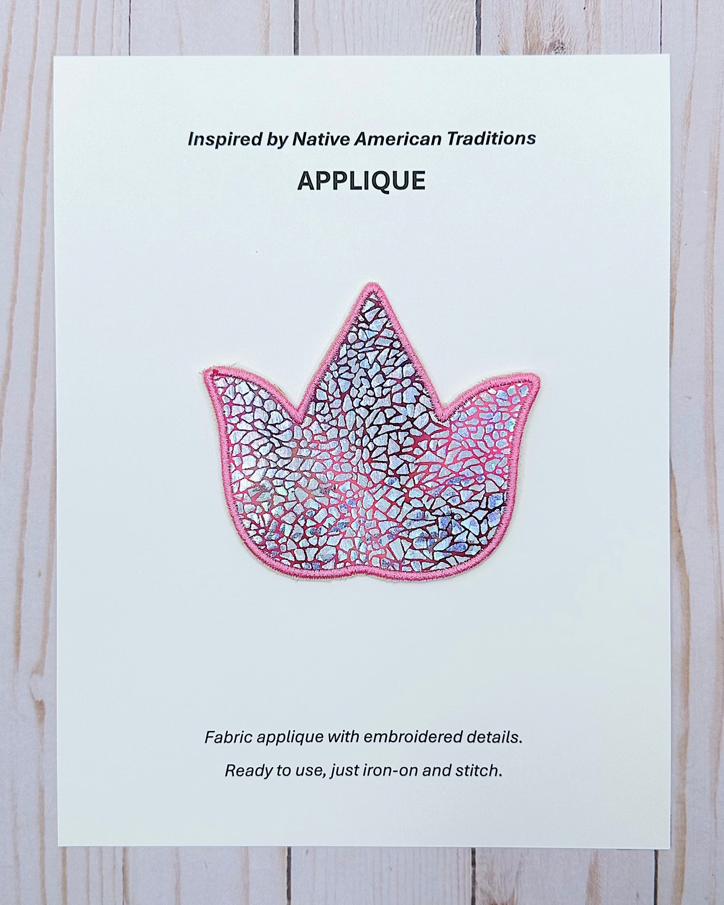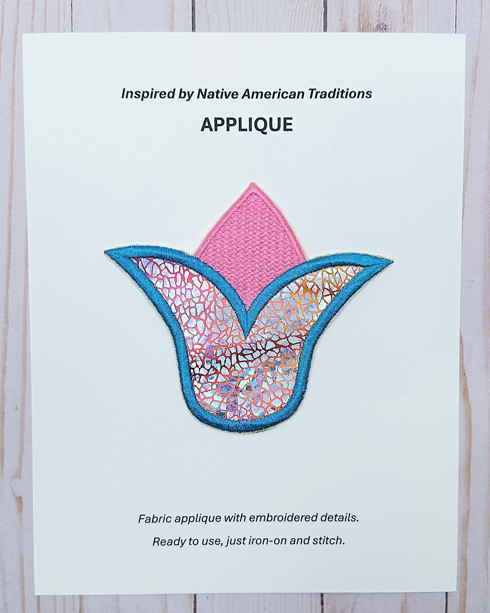 Enhance your projects with this intricately embroidered fabric appliqué, designed for effortless application. Just iron it on and sew for a secure, lasting hold. Perfect for ribbon skirts, shirts, vests, bags, traditional regalia, and more.